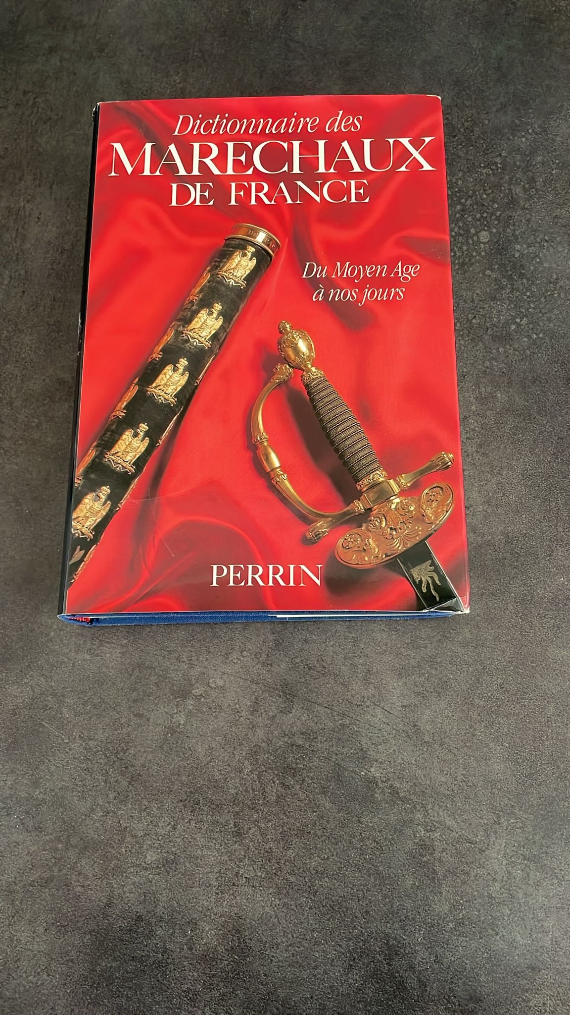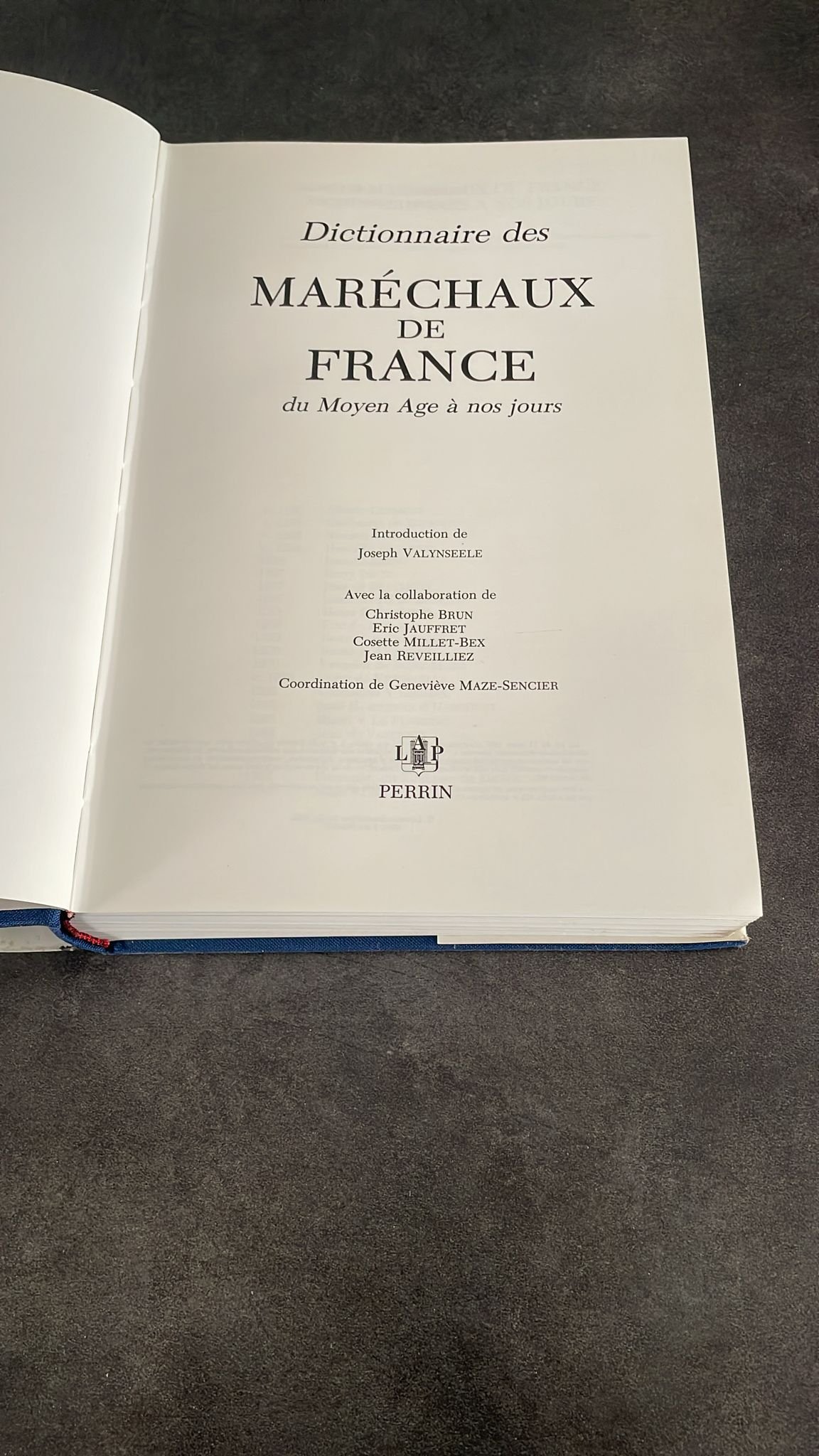 DICTIONNAIRE DES MARECHAUX DE FRANCE Du Moyen Age à nos jours Introduction de Joseph VALYNSEELE. En collaboration avec Christophe BRUN, Eric JAUFFRET, Cosette MILLET-BEX, et Jean REVEILLIEZ. Coordination de Geneviève MAZE SENCIER Editions LIBRAIRIE ACADEMIQUE PERRIN, 1988, FORMAT 26 CM X 18 CM RELIE TOILE BLEU. JAQUETTE ILLUSTREE.