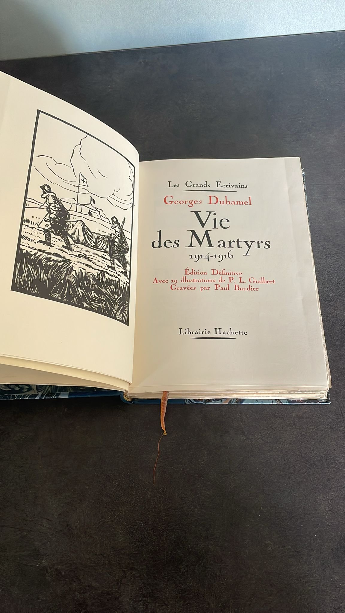 Reliure Vie des Martyrs 1914-1916 sur , Georges Duhamel, 19 illustrations de P.L. Guilbert gravées par Paul Baudier, Grands Ecrivains Hachette 1929